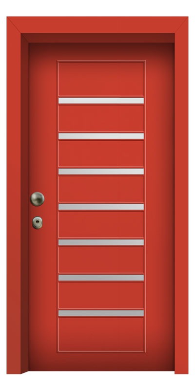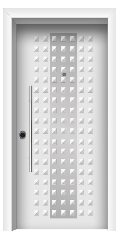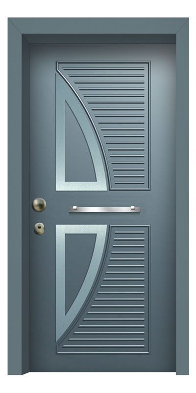 Οι πόρτες με πρεσσαριστές επενδύσεις αλουμινίου χρησιμοποιούνται κατά κύριο λόγο σε εξωτερικούς χώρους διότι είναι κατασκευασμένες με πολυκαρβονικό φύλλο ως υλικό πλήρωσης αντί ξύλου MDF. Μέσω αυτής της τεχνικής επιλύονται χρόνια προβλήματα όπως, φουσκώματα επενδύσεων, αποκόλληση λαμαρίνας και παραμόρφωση επιφάνειας λόγω συστολής-διαστολής. Ακόμα είναι δυνατή η τοποθέτηση INOX διακοσμητικών